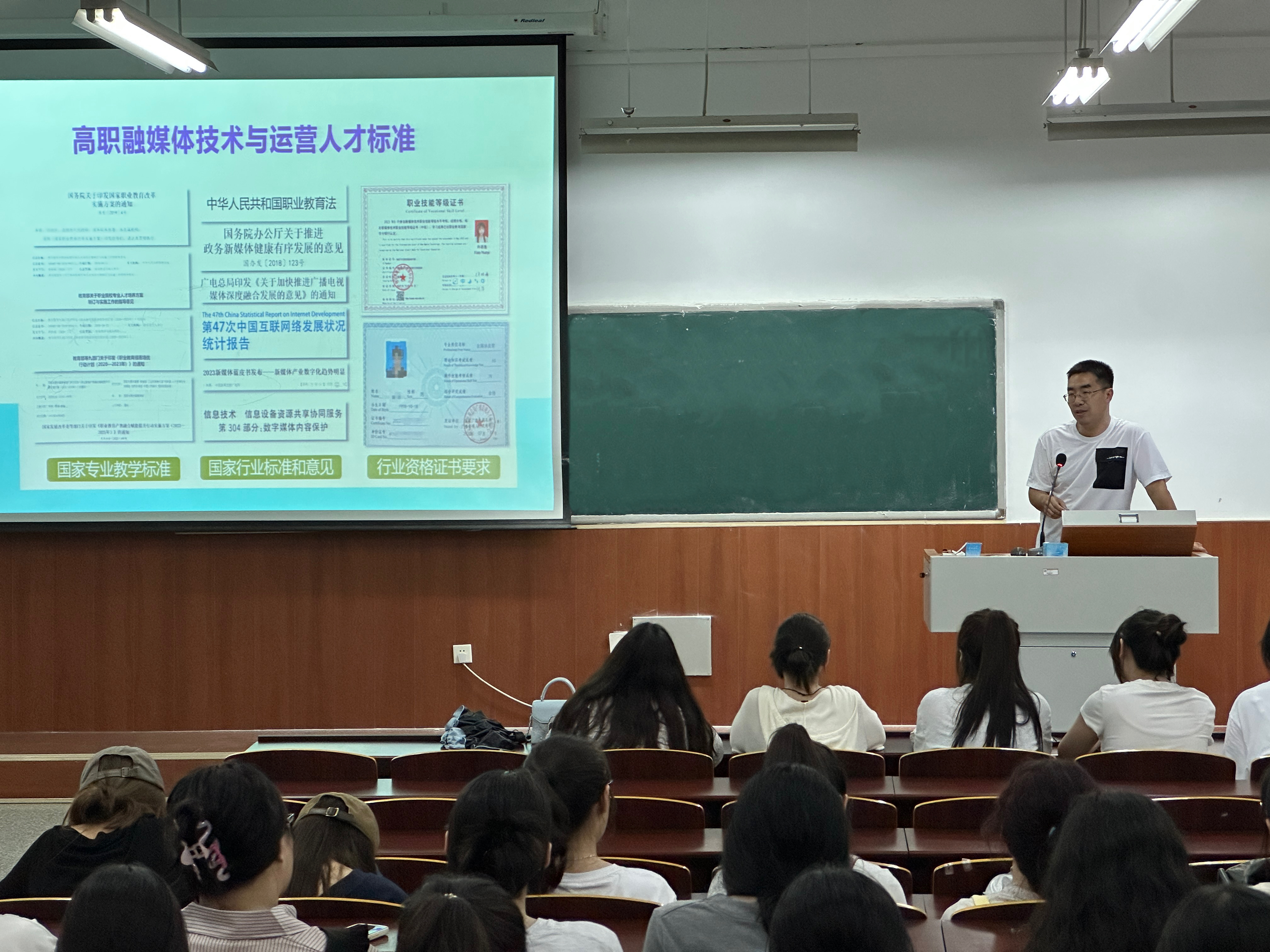 本次的专业教育讲座为各位新生详细介绍了人才培养方案、课程设置及职业前景。管理教研室主任朱春江针对婴幼儿托育服务与管理和人力资源管理专业的学生,着重强调了专业课程与行业需求的紧密结合,系统地指导了学生规划其学业与职业路径,确保学生对未来职业有一个清晰的认识和准备。传媒教研室主任许一格、骨干教师侯和君、王艺洁分别向融媒体技术与运营、全媒体广告策划与营销和现代文秘等专业的学生,深入解析了校企合作的模式及职业技能认证考核的重要性,提供了关于如何在未来职场中脱颖而出的实用指导。