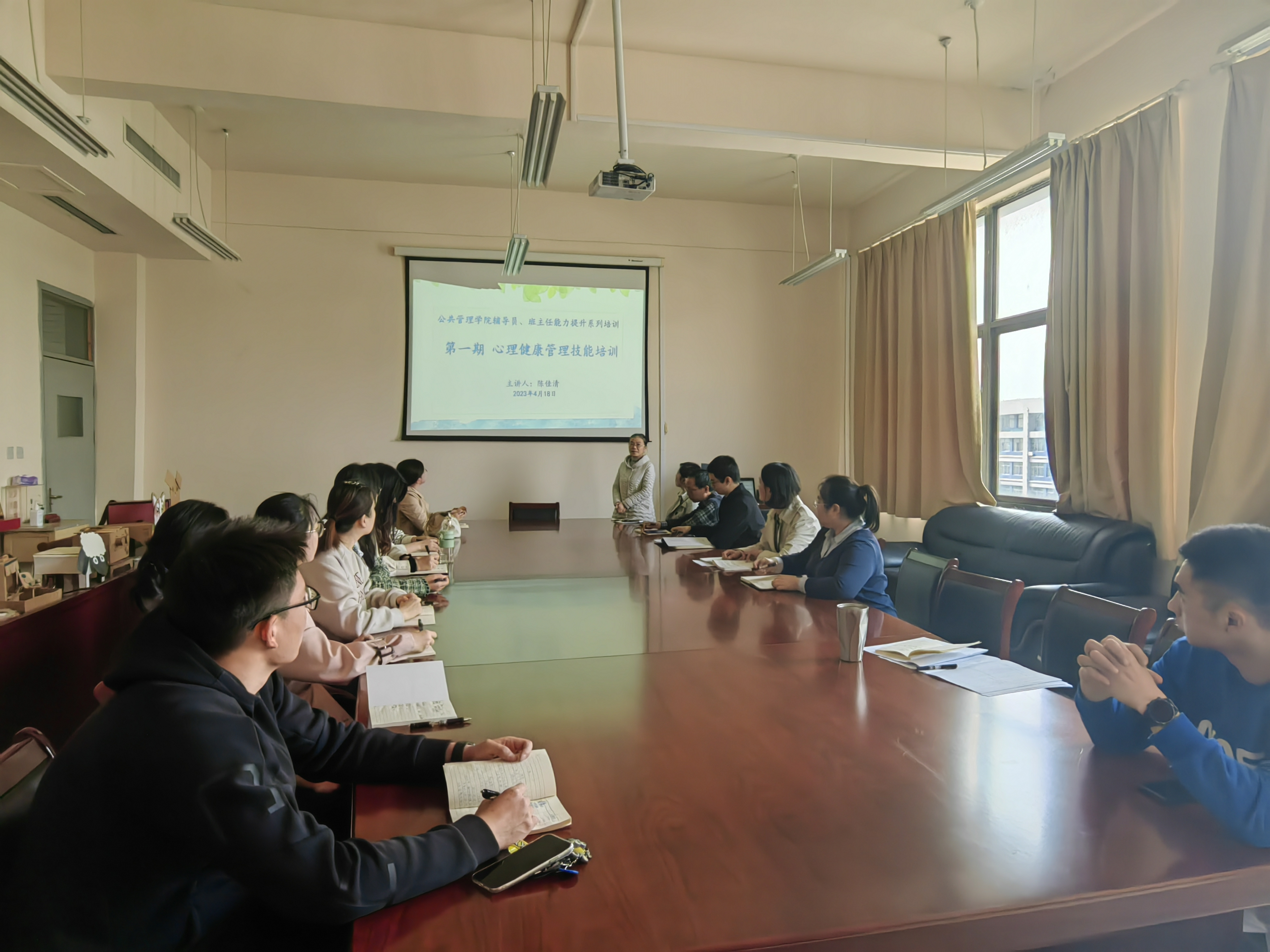 为了切实推进学院心理健康教育工作,进一步提高辅导员、班主任对学生早期心理问题的识别与干预能力,促进学生身心健康发展,构建和谐平安校园,4月18日下午,公共管理学院组织开展辅导员、班主任能力提升系列第一期培训。活动邀请国家二级心理咨询师陈佳清老师作心理健康管理技能指导。公共管理学院党总支副书记孙明珠、全体辅导员和班主任共16人参加培训。
