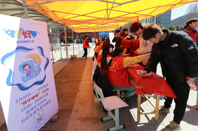 活动前期,商学院借助微信公众号和主题班会形式向同学们广泛宣传此次活动的意义、内容和参与方式。3月20日中午,商学院组织学生志愿者在学校食堂门前广场放置活动展板和横幅,向路过学生宣传科学睡眠知识,了解大家的睡眠状况,针对同学们不同类型的睡眠困扰提供改善建议,并号召大家积极参与“守护好梦”晚安睡眠打卡活动。参与打卡活动的同学被要求每天晚上不超过23点入睡,每日借助相关软件记录入睡时间并将截图上传至指定群中进行打卡,一个月内坚持健康睡眠打卡达到25天,即可在活动截止后领取精美礼品。在场的同学们反应热烈,纷纷报名参加活动,并在横幅上签名响应,条幅上留下的一个又一个名字,体现着一份份对健康睡眠的肯定与承诺。