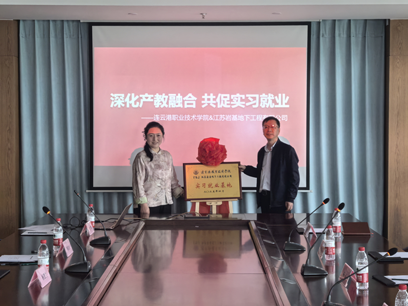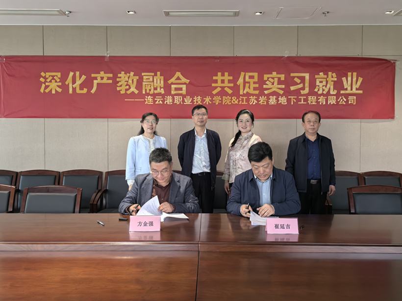 崔延吉介绍了公司发展情况和技术优势,提出企业今后的人才需求方向。校企双方达成以下合作意向,一是为2025届建筑类毕业生提供现场施工员、预算员等实习就业岗位约25个,二是共建地下工程“现场工程师”班,实施“双导师”制;三是合作开发新思政课程,将扬州特色街非遗文化进课堂;四是深度开展产教融合,构建建筑行业校友资源共享平台。随后,双方共同签署《产教融合校企合作框架协议》,并为“连云港职业技术学院实习就业基地”揭牌。