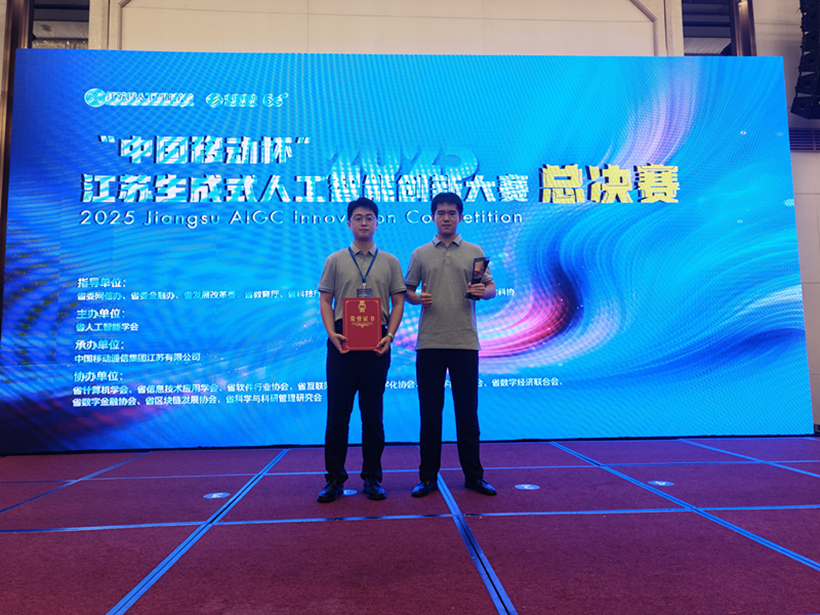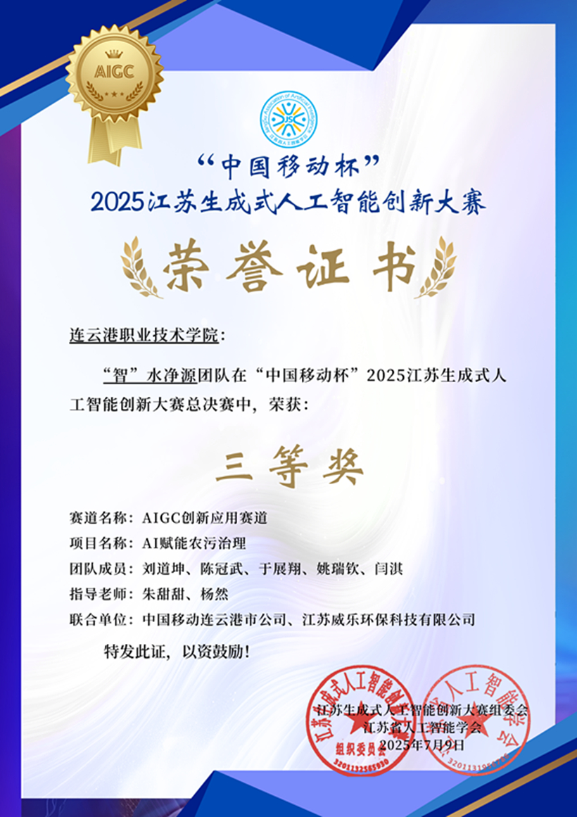 日前,我校信息工程学院“智”水净源团队在“中国移动杯”2025江苏生成式人工智能创新大赛总决赛中荣获三等奖。