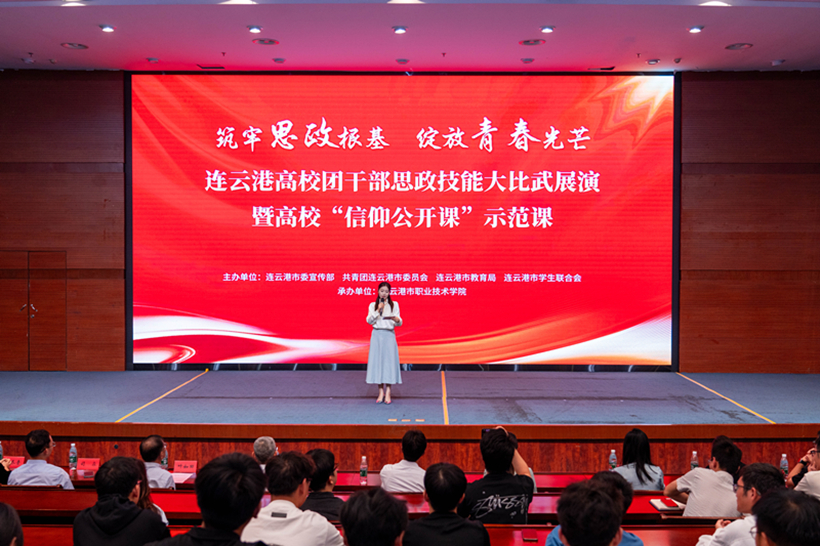 为深入学习贯彻习近平总书记关于加强高校思想政治工作的重要讲话精神,引导广大青年把青春书写在为中国式现代化挺膺担当的新征程上,9月30日上午,我校承办的连云港高校团干部思政技能大比武展演暨高校“信仰公开课”示范课在图书馆报告厅圆满落幕。本次活动由连云港市委宣传部、共青团连云港市委员会、连云港市教育局、连云港市学生联合会主办。市委教育工委副书记林田海、市委宣传部四级调研员冷学善、团市委副书记闫美玲、校党委副书记叶如田、各在连高校团委书记、本次比赛获奖选手以及我校观摩师生代表共160余人参加活动。