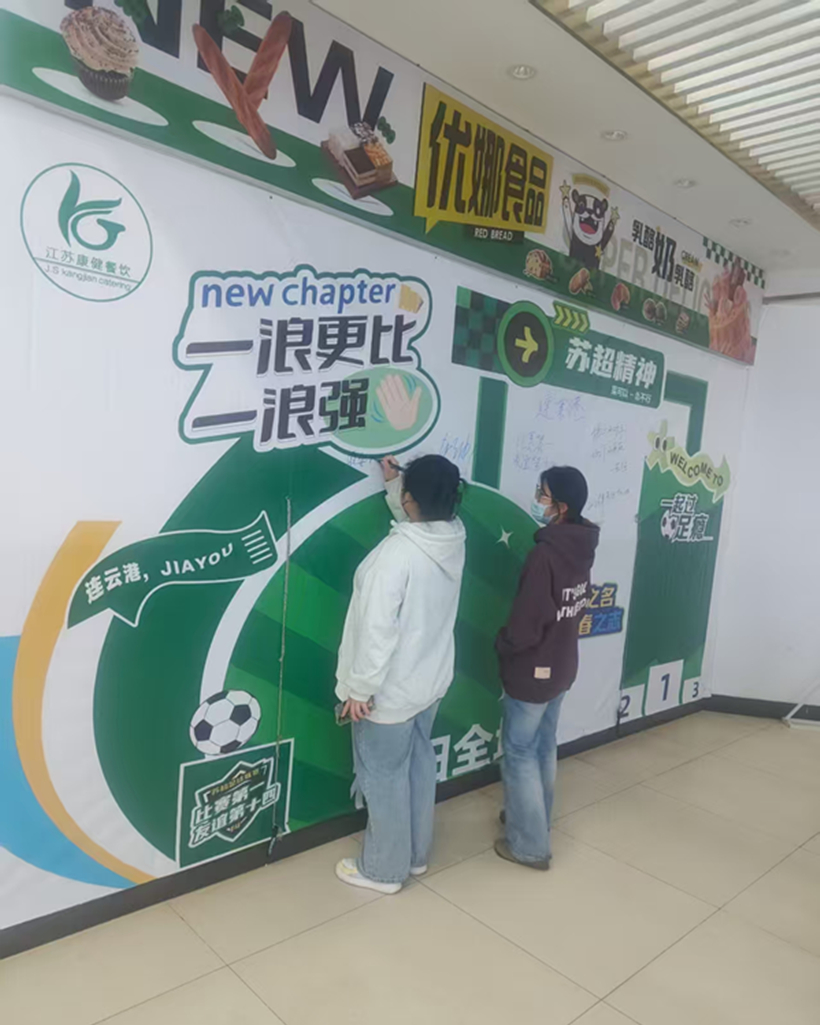 近日,校园内的东二食堂焕然一新,以苏超联赛精神为主题的装饰让这里充满了活力与激情,为广大师生带来了全新的体验,也将体育精神融入到了校园生活的每一个角落。