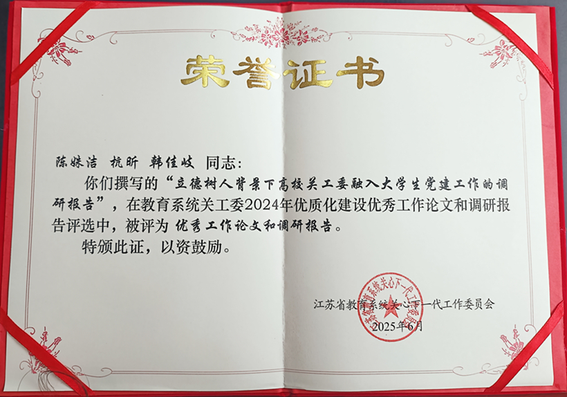 近日,江苏省教育系统关工委下发了《关于公布教育系统关工委2024年优质化建设优秀工作论文和调研报告名单的通知》文件,我校陈姝洁、杭昕、韩佳岐老师撰写的《立德树人背景下高校关工委融入大学生党建工作的调研报告》,被评为“优秀工作论文和调研报告”。