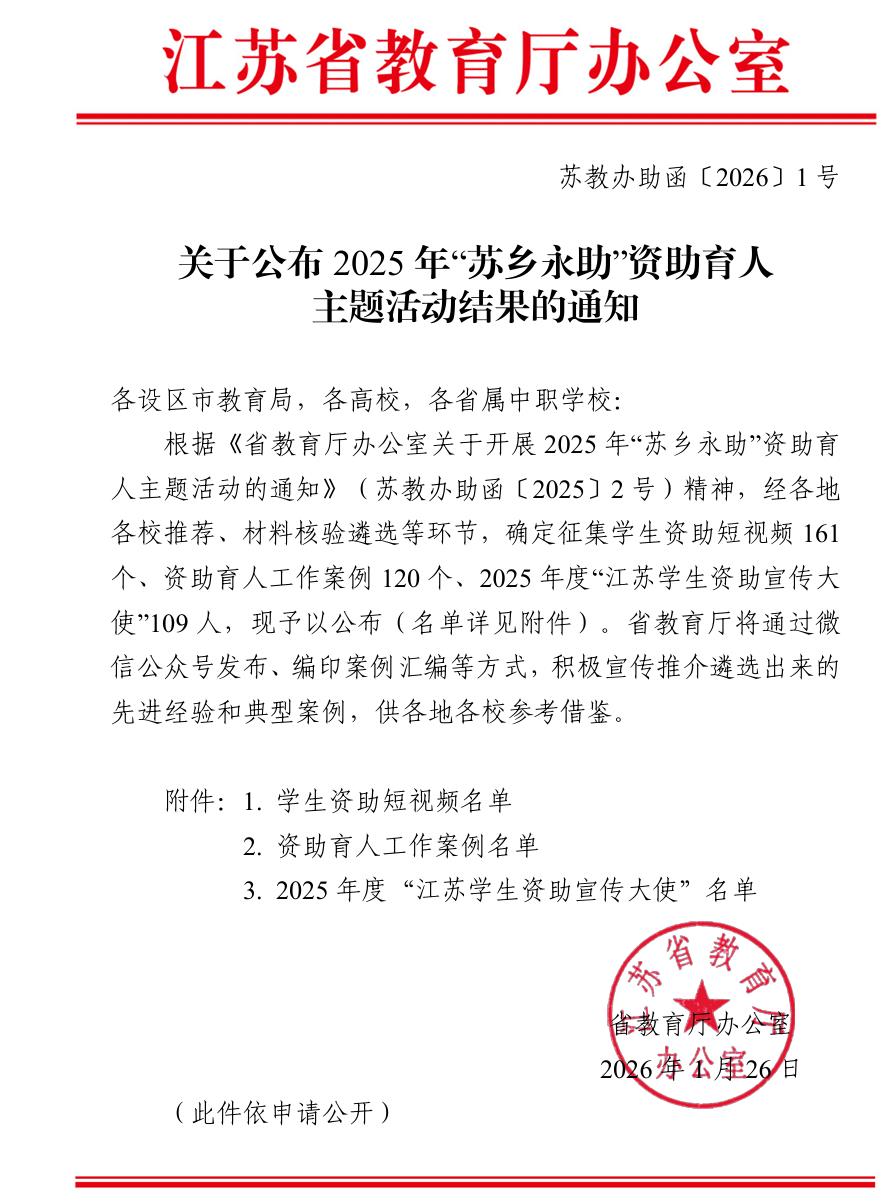 近日,由江苏省教育厅主办的2025年 “苏乡永助” 资助育人主题活动评选结果正式揭晓。我校精心推选的三个优秀项目凭借鲜明的主题特色、扎实的实践成果和创新的呈现形式,在全省众多参评作品中脱颖而出,一举斩获多项重要表彰,充分彰显了我校资助育人工作的扎实成效与鲜明特色。