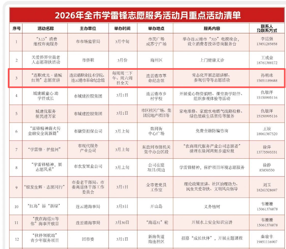 启动仪式上发布了2026年学雷锋志愿服务重点活动清单。清单内容涵盖为老服务、儿童关爱、社区治理、科普宣传、非遗传承、应急保障等多个领域,精准对接群众实际需求,明确了各活动的开展时间、责任单位和服务内容,为整个志愿服务月活动有序推进提供了清晰指引。我校“晨光”退役大学生士兵志愿服务队的“连职戎光•港城红韵”志愿宣讲项目荣获2026年全市学雷锋志愿服务活动月重点活动殊荣。