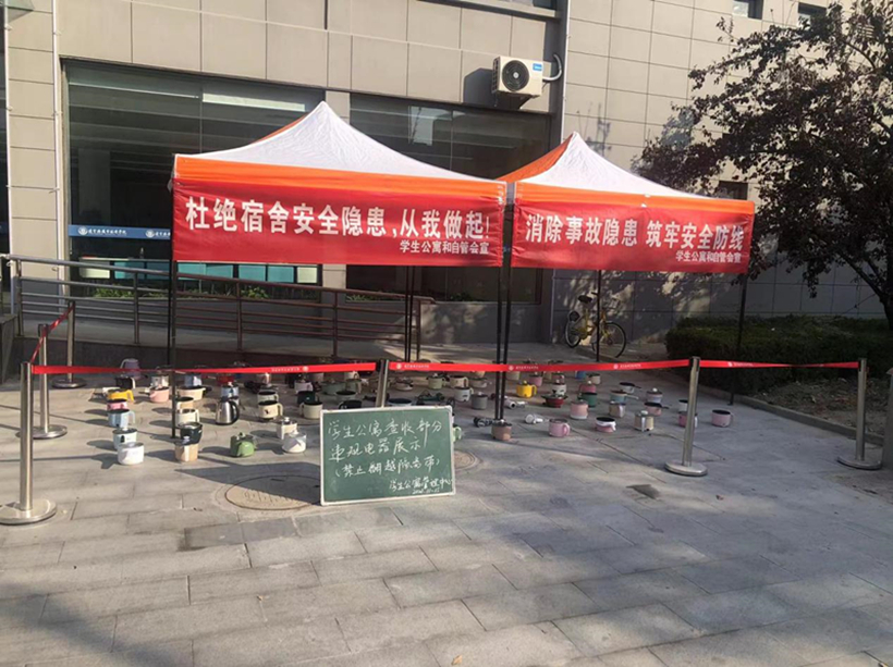 11月15日—16日,学生工作处(学生公寓管理中心)在大学生服务中心门口集中展示了100余件学生宿舍常见的各类违禁物品,包括电饭煲、电水壶、电热锅、电磁炉、管制刀具等物品,通过违禁物品展示,向学生们宣传学生宿舍使用违禁品的危害以及防火防盗、安全用电等宿舍安全常识。提高了学生们的校园安全意识,敲响了安全警钟,推进学生公寓安全管理工作。