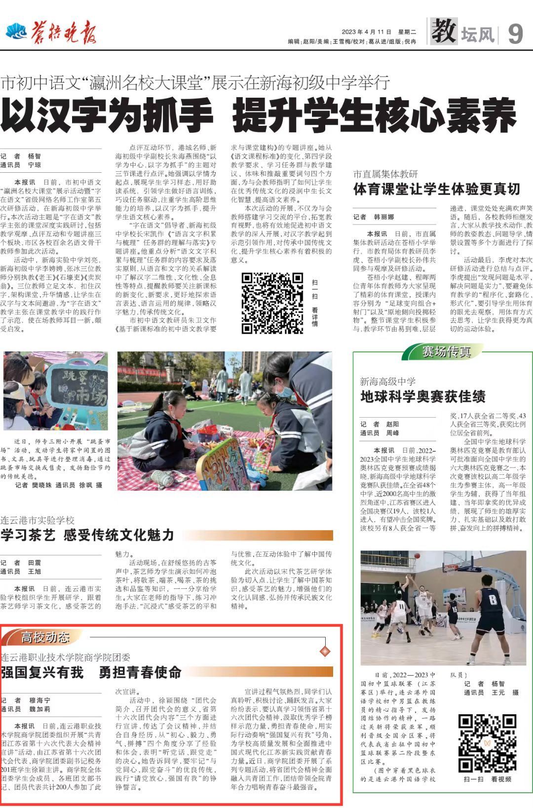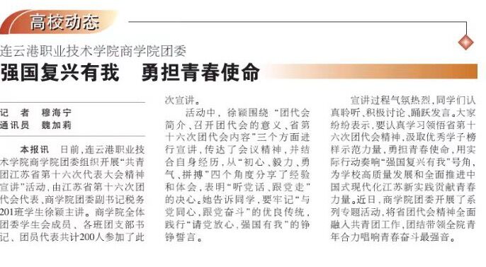 2023年4月11日,《苍梧晚报》在“教坛风”专栏刊发商学院团委《强国复兴有我勇担青春使命》文章,该文章报道了商学院团委开展“共青团江苏省第十六次代表大会精神宣讲”活动,全文如下: