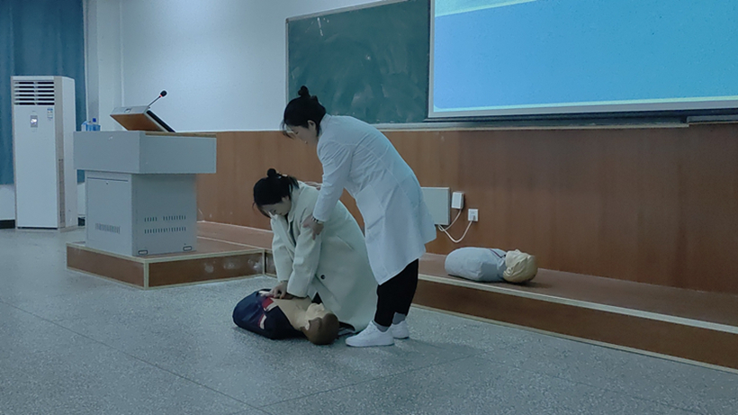 讲座特邀校医务室吴茂兰医生主讲。吴医生先是为同学们介绍了生活中常用的医护急救知识和要点,如拨打急救电话应明确时间、人物和地点,拨打电话时要牢记“对方让放电话才可放电话”等。随后,吴医生重点讲解了心肺复苏的实施方法和注意事项,强调当患者发生呼吸心跳骤停时,需要立即给予复苏,复苏开始越早,存活率越高。吴医生生动详实的讲解引起了同学们的极大兴趣,大家认真聆听,争先恐后提问,现场氛围热烈。部分同学受邀参加现场急救演示,将理论知识付诸实际操作,熟悉心肺复苏的急救步骤,练习正确手法。通过学习,同学们初步掌握了正确急救方法,大家感叹:“掌握这些急救知识,就可以在发生意外时,在救护车到来之前的黄金时间挽救生命!”