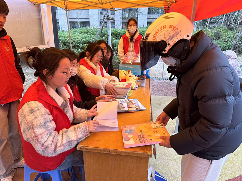 当天下午2点,志愿者们准时到达位于恒润郁洲府小区的外仓社区服务中心,统一着装、有条不紊地做好书籍捐赠活动的前期准备工作。活动开始后吸引了众多社区居民前来咨询,同学们耐心地向大家讲解参与方式,并通过物品奖励的方式鼓励他们捐赠闲置图书。居民们纷纷带着家中闲置书籍在登记处排起长队踊跃捐书。其中,参与捐赠的李爷爷说,把书捐给社区,捐给有用的人,可以和更多的年轻人分享知识跟读书的喜悦,这比放在家里闲置或卖给卖废品的更加有意义!不少小朋友也纷纷拿上绘本、故事书来到捐赠现场,将自己心爱的图书分享给其他小朋友。此次爱心捐书活动共收到捐赠图书609册,书籍涵盖儿童读物、文学、小说、自然科学等多个种类。同学们将收到的捐赠图书一一进行登记、录入,整理完成后全部用于充实外仓社区图书馆,与社区共建书香社会。