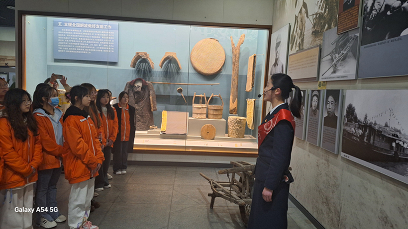 在纪念馆序厅前,大家整齐列队,肃立默哀,并依次献上鲜花,表达着对革命先烈的哀思与敬意。随后,师生们一行在专业讲解员的带领下,先后参观了五四运动时期、土地革命时期、抗日战争时期和解放战争时期展厅,通过一幅幅珍贵的图片、一件件馆藏革命文物,了解了许多革命先烈的英勇事迹和感人故事。最后,孙明珠副书记以连云港市革命纪念馆新时代“小推车”志愿讲解员的身份为师生讲述《新时代小推车手》红色故事,通过淮海战役“支前模范”董力生和小推车的动人故事,结合自己在纪念馆吸收养分、参与志愿服务的经历,向大家传递着奉献精神。同学们纷纷表示要珍惜这来之不易的和平年代,不辜负先烈们的遗志,勇担新时代赋予青年的使命。