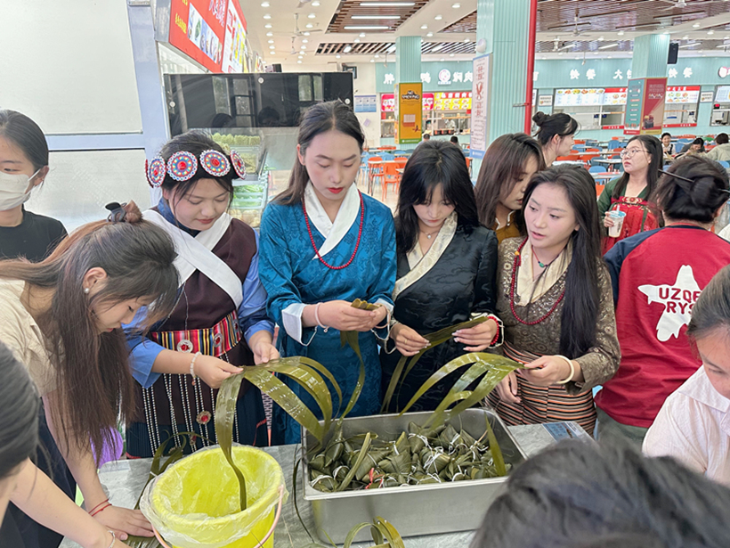 活动开始前,各民族师生身着精美的汉服以及各具特色的民族服饰,齐聚在东二食堂活动现场。“粽香四溢,巧手传情”粽子DIY拉开了此次活动的序幕,师生们各显神通,有的坚守传统选用经典馅料,有的大胆创新尝试新式搭配,制作出形态多样、馅料丰富的粽子,现场弥漫着粽叶的清香,欢声笑语不绝于耳。在“竹韵翩翩,艾草飘香”竹编艾草挂饰制作环节,师生们运用非遗竹编技艺,创作出造型多样的艾草挂饰,每个作品巧妙搭配了艾草、端午卡片和五彩绳,不仅美观实用,更充满了美好的寓意,充分展现了传统工艺的独特魅力。进入“香飘四溢,祈福安康”香包制作环节,师生们精心挑选了丁香、合欢花、薄荷等12味天然中草药,亲手缝制香包,深入了解中草药功效,感受传统手工艺魅力。经过精心缝制,每个人都拥有了自己独一无二的香包,这些香包寄托了大家对吉祥、祈福的美好愿望。此外,“艾草寄情,花束献礼”艾草花束制作活动备受在场学生的欢迎,同学们巧妙运用新鲜艾草、端午主题吊牌和铃铛等材料,精心制作出一束束别具一格的艾草花束。他们将这些富有创意和心意的花束献给在场的老师们,以此向辛勤耕耘的园丁们表达最真挚的敬意和节日的美好祝愿。最后,“五彩绳绕腕,祥瑞伴身旁”五彩绳制作将此次活动推向了高潮。师生们用五彩平安绳搭配手编钱袋、粽子、柿子等各式配饰,尽情发挥想象力和创造力,编织出一个个独具个性的五彩绳手链,在实践中感受手工艺带来的乐趣。