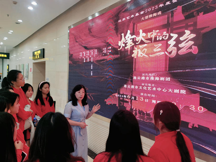 为贯彻习近平文化思想和习近平总书记关于美育的重要指示批示精神,全面实施学校美育浸润行动,6月13日下午,艺术与旅游学院党总支、关工委、团委及“美云美育”工作室组织100余名师生前往连云港市文化艺术中心,观看由连云港市淮海剧团精心打造的大型淮海戏《烽火中的板三弦》。
