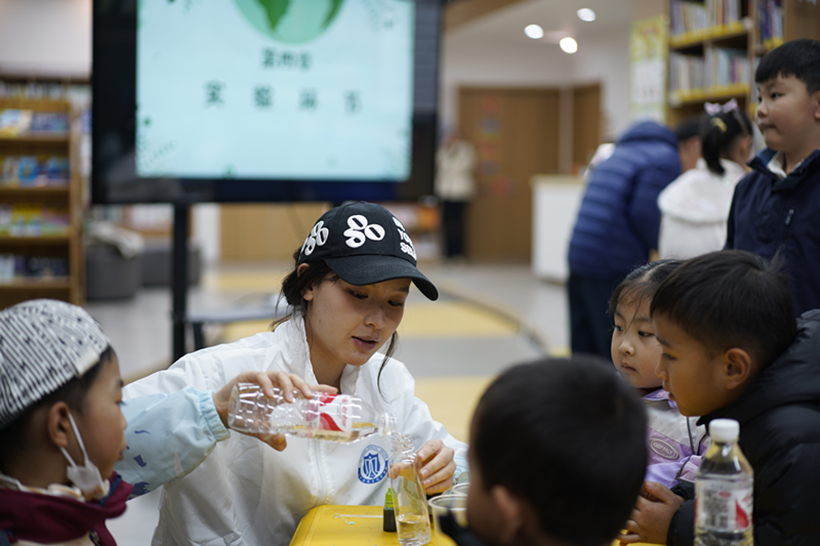科学实验环节,志愿宣讲员用“自制污水净化装置与毛细现象的探索之旅”作为引子,向小朋友们介绍了污水净化装置的构成,深入浅出地讲解了这一物理原理,并通过实验演示,让小朋友们亲眼见证了污水在净化装置中逐渐变得清澈的过程,不仅激发了小朋友们对科学的浓厚兴趣,还让他们深刻体会到了环保实践的乐趣和意义。在实验过程中为每个小组分配了专门的志愿者,帮助小朋友们操作实验,解答他们在实验过程中遇到的问题,小朋友们认真思考,积极互动。