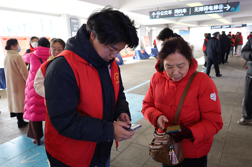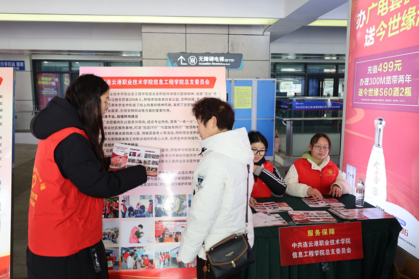 本次活动在连云港站站前广场举行,共有26家单位参与,吸引了众多市民和来往旅客的关注。活动过程中,我院“芯光”志愿服务队的成员们表现积极踊跃,他们向旅客展示了信息工程学院过去一年开展的各类志愿服务活动,如社区服务、支教活动等,还发挥专业特长,结合当下热点,宣讲了Deepseek基础功能及人工智能技术的特点,帮助旅客们将AI技术进一步融入生活。此外,志愿者们还现场普及了智能手机、智能电视等智能设备的使用知识和技巧,帮助旅客们更好地享受数字化生活带来的便利。