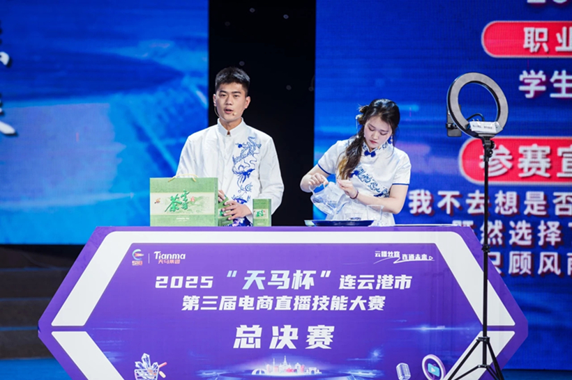 2025年4月23日,“云播丝路·连通未来”2025年“天马杯”连云港市第三届电商直播技能大赛决赛圆满收官。来自中国、哈萨克斯坦、老挝等国家的24名选手同台竞技,经过激烈角逐,数字商务学院李子浩、陈梦娇两名学生分别获得“港城优品”赛道第四名和第六名,展现出新时代高校学生的创新活力与专业素养。