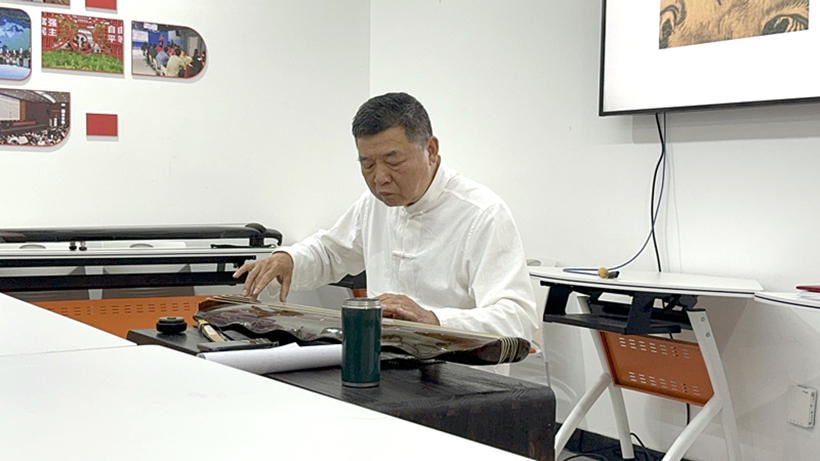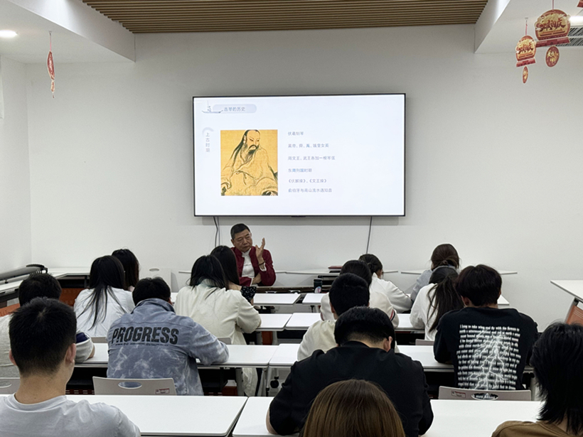 曹继瑛潜心古琴制作与演奏三十余载,其斫制的古琴音色清润悠远,形制古朴典雅。讲座中,曹老师以“古琴—千年文脉的心灵回响”为主题,从古琴的历史渊源、文化内涵及制作工艺入手,结合自身传承与创新实践,生动诠释了古琴艺术“天人合一”的哲学境界。他通过现场演奏《流水》《梅花三弄》等经典曲目,带领师生感受古琴音韵的虚实相生与意蕴深远,并详细解析了古琴制作中选材、挖槽、髹漆等关键技艺,强调“斫琴即修身,琴品如人品”的匠人精神。