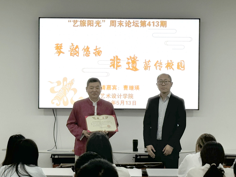 为进一步弘扬中华优秀传统文化,推动非遗技艺的传承与发展,提升学生艺术修养坚定文化自信,近日,艺术设计学院在一站式学生社区举办《周末论坛》第413期“琴韵悠扬 非遗薪传校园”专题讲座。讲座特邀高级古琴斫琴师、连云港市非物质文化遗产项目制作技艺代表性传承人曹继瑛老师主讲。艺术设计学院党总支书记王少勇、院长赵子昂出席活动,30余名师生到场听讲。