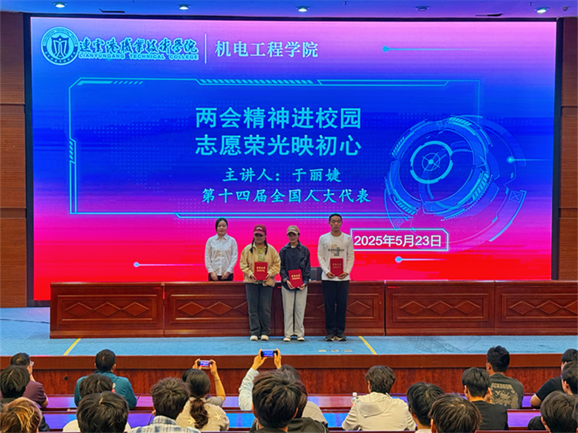 2025年5月23日,机电工程学院在图书馆报告厅成功举办“两会精神进校园、志愿荣光映初心”主题报告会。学院特邀第十四届全国人大代表、连云港交通控股集团新浦汽车总站副站长、第六代“雷锋车”车手于丽婕担任主讲嘉宾,为师生深入解读十四届全国人大三次会议精神。机电工程学院党员教师代表、入党积极分子、发展对象、学生党员和红齿轮志愿者参加报告会,机电工程学院党总支书记程皓主持报告会。