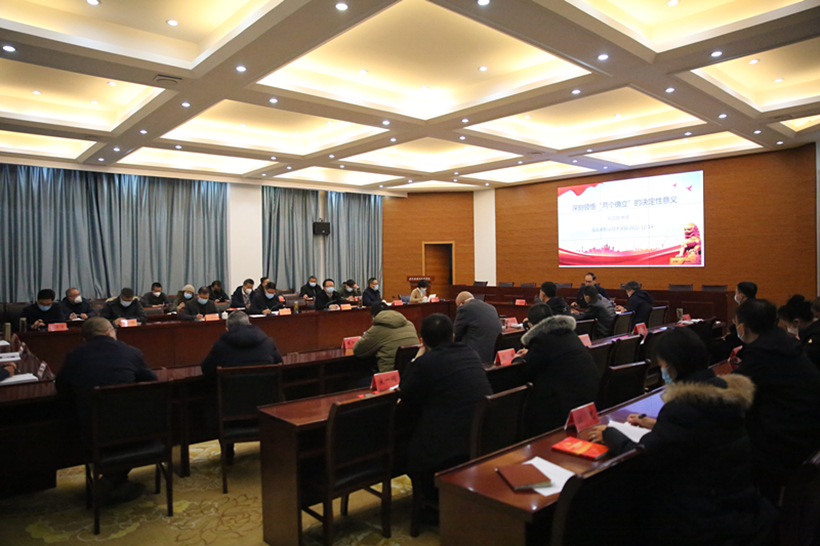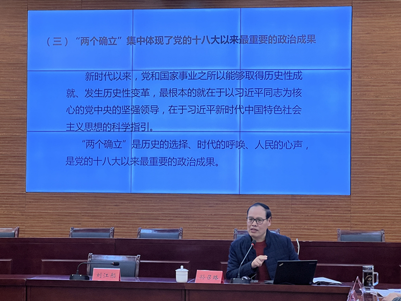 会议特邀连云港师范高等专科学校马克思主义学院教授、中共连云港市委理论宣讲团宣讲员孙召路为大家做专题讲座。孙召路以《深刻领悟“两个确立”的决定性意义》为题,详细讲解了“两个确立”的科学内涵,系统总结了“两个确立”的历史内涵,深刻阐释了“两个确立”的决定性意义。讲座观点鲜明,逻辑清晰,内涵丰富,既有政治高度、理论深度,又有历史厚度、现实力度,进一步增强了与会人员对“两个确立”的政治认同、思想认同、理论认同、情感认同,为深刻理解和准确把握党的二十大精神提供了完备的思路和具体的指导。