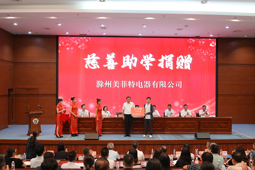 我校刘江船书记着重说明了我校完善学生资助体系,推动资助工作高质量发展的举措以及下一步的工作打算。领导嘉宾为学生资助中心授牌,张兆臣理事长分别接受滁州美菲特电器等公司捐赠牌并为企业颁发证书。