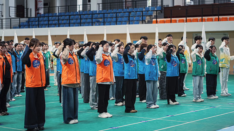 全体志愿者在我校林园树同学的带领下庄严宣誓:“为港城添彩,为省运争光,以港城青年担当作为,为赛事贡献青春力量。”连云港师范学院李晓博作为志愿者代表发出倡议,号召大家以专业服务展现风采,在奉献中闪耀青春。