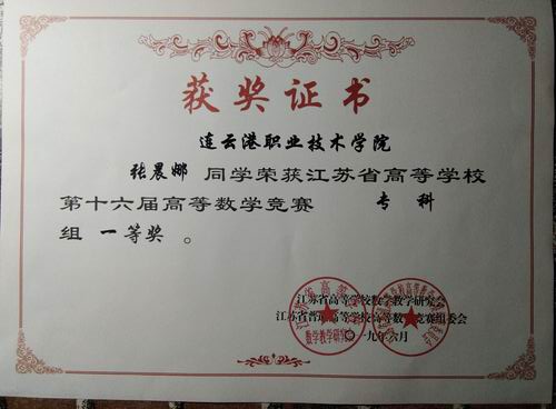 江苏省高等数学竞赛是从1992年开办,经省教育厅批准开展的大学生竞赛活动,至今已举办了十六届,是江苏省层次最高、参与度最广、影响最大的高校数学赛事,我校历来重视此赛事,赛前在学校领导和教务处等部门的支持下,基础课部领导精准定位下,数学教研室制定详细实施方案,辅导老师利用周末及晚自习等课余时间辅导学生,最终,我校药品生产技术171班张晨娜在全省近10000人数学优秀选手中脱颖而出,取得了全省第八、苏北地区第一的好成绩。