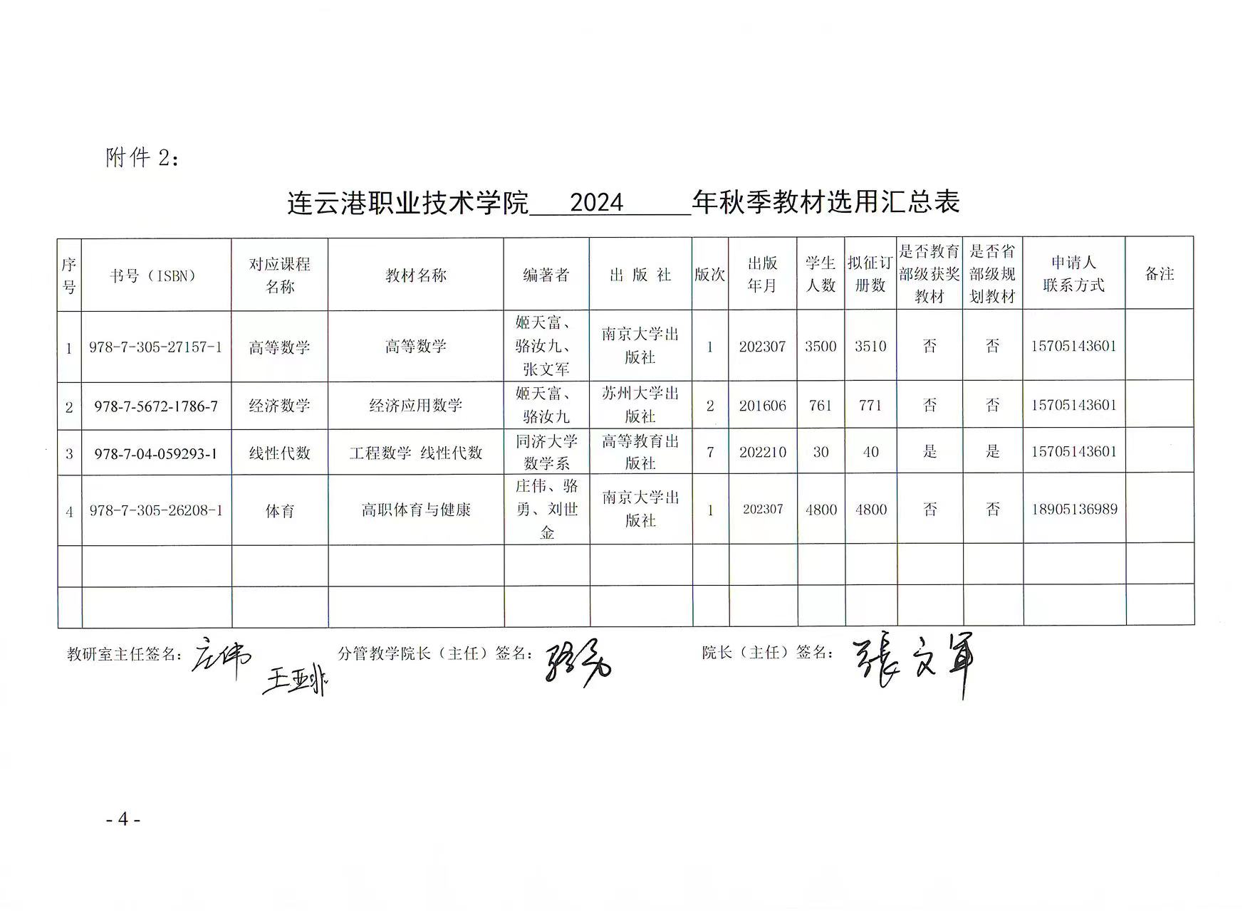 经征求任课教师意见,教研室主任和部门领导同意后,使用下列教材作为2024年秋季教材,具体见附件。特此公示。