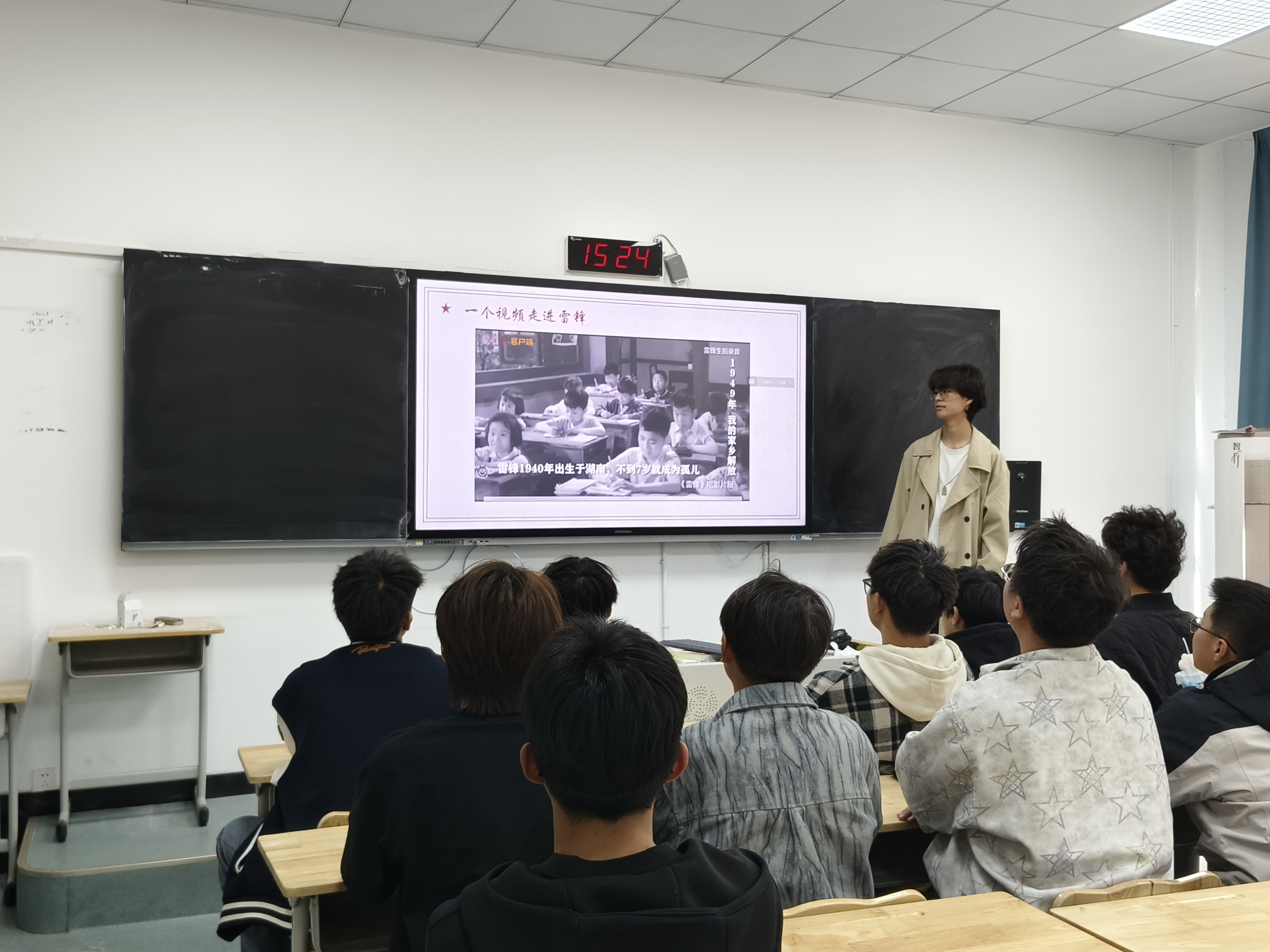 活动伊始,主持人田赛豪以一段视频带领同学们走进雷锋的世界,随后深入阐述了雷锋精神的内涵,让大家对雷锋精神有了初步认识。接着,通过讲述雷锋生平的三个故事,印证了“雷锋出差一千里,好事做了一火车”的佳话,使同学们对雷锋精神的认知更加深刻。在后续环节中,田赛豪从“赏雷锋名言”与“践行雷锋精神”两个角度全面概述,让同学们不仅学到了雷锋精神,更明白了如何在生活中践行。活动最后,田赛豪率先举起右拳,带领同学们庄严宣誓,铿锵有力的声音响彻整个教室,展现出坚定的决心。
