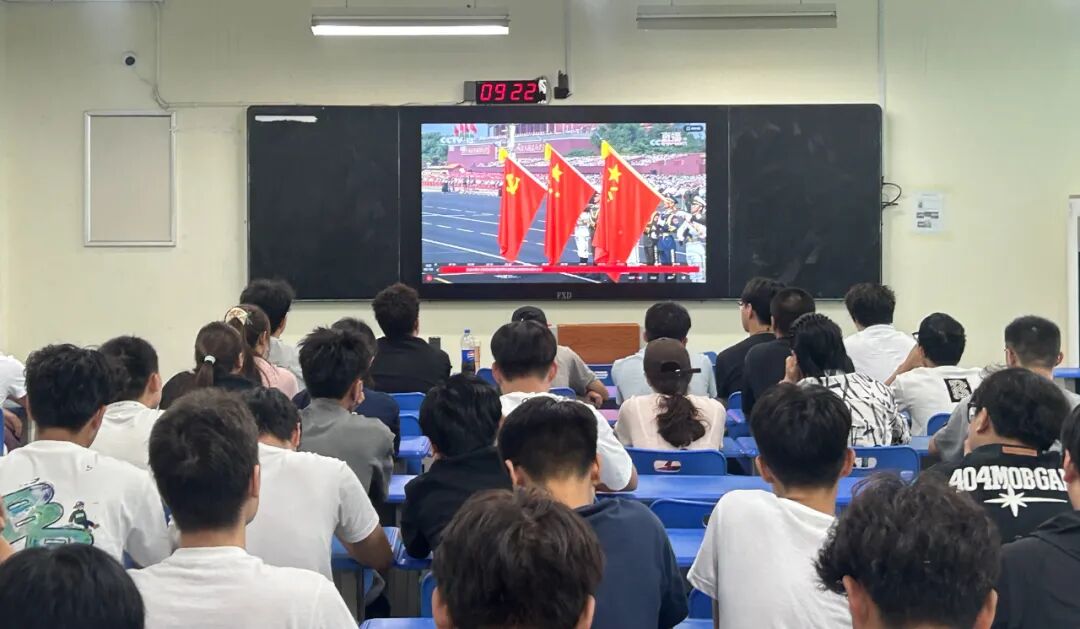 2025年9月3日,纪念中国人民抗日战争暨世界反法西斯战争胜利80周年阅兵仪式在北京天安门广场隆重举行。为铭记历史、缅怀先烈、珍爱和平、开创未来,深刻感悟伟大抗战精神,机电工程学院组织学生在智慧教室118集中观看现场直播,共同见证国家强大、军队威武的历史性时刻,感受伟大祖国的繁荣昌盛。