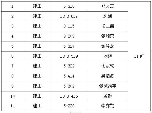 根据第七、第八周检查情况,经校学生公寓管理中心遴选和复核,确定建筑工程学院11间宿舍作为第七、第八周文明宿舍,现予以公示。