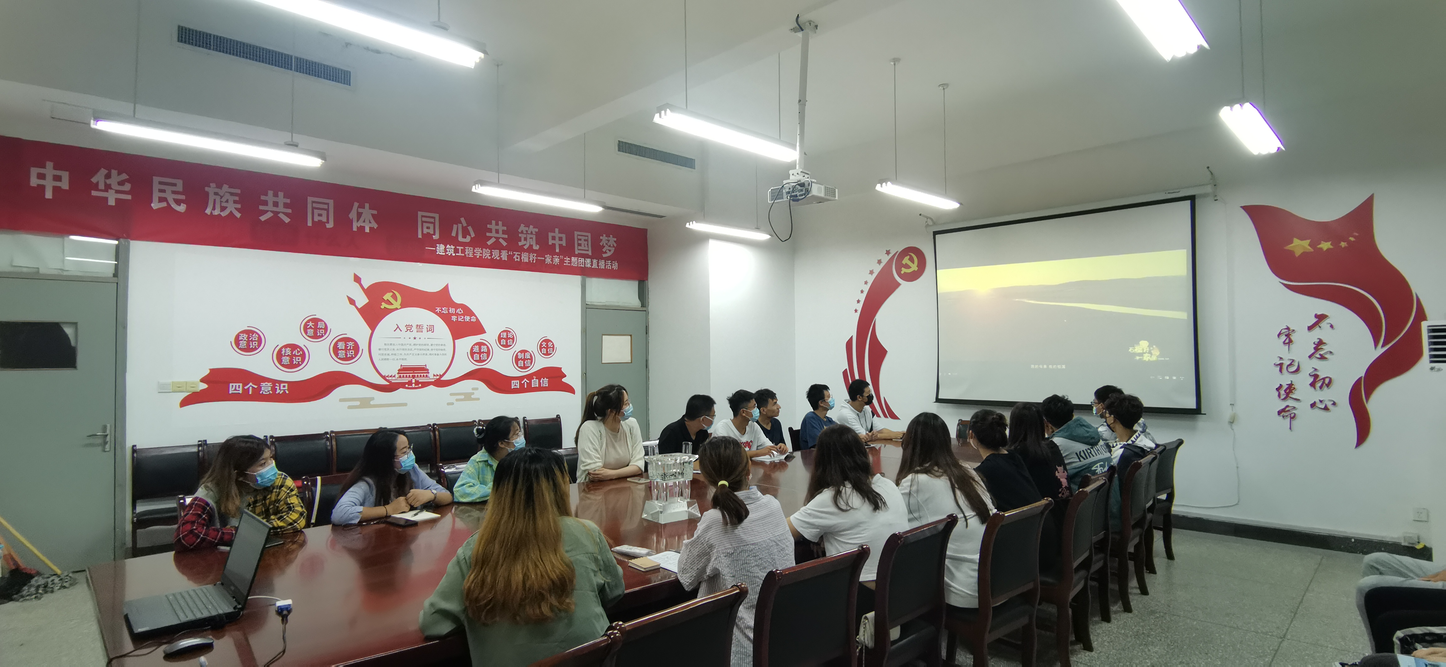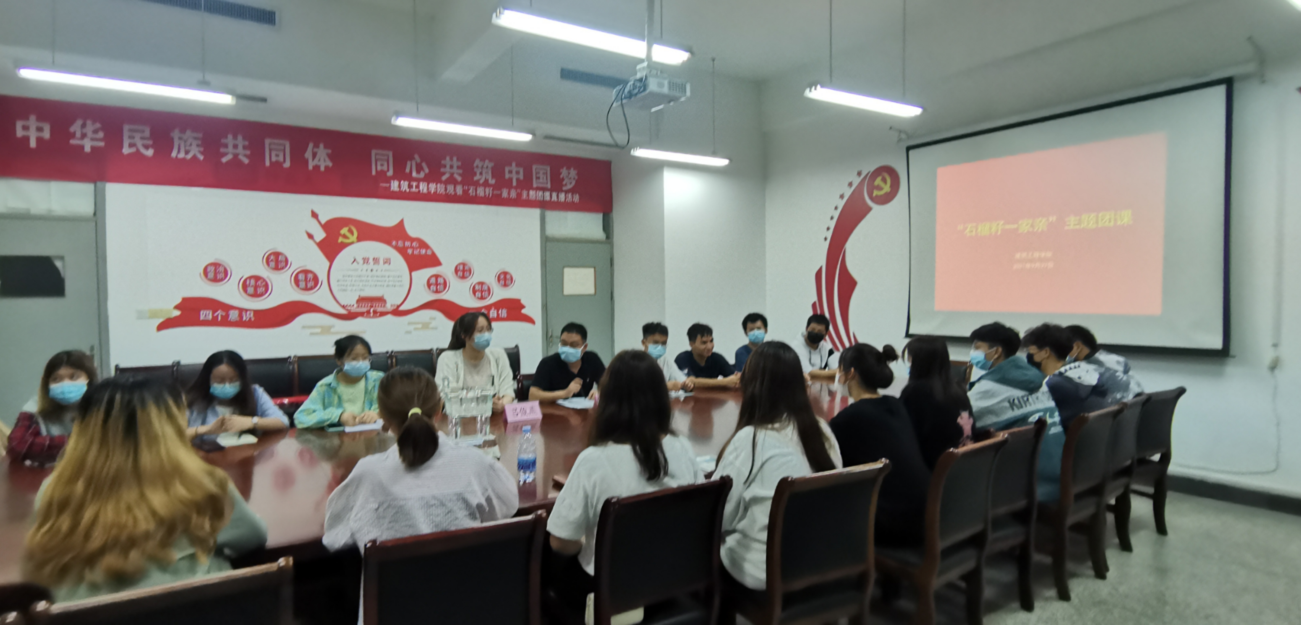 9月27日晚上,建筑工程学院党总支副书记、副院长方金强、团委老师吕俊燕、各班级团支部书记和少数民族学生代表一起在博远楼526会议室观看由共青团中央推出的“石榴籽一家亲”主题团课队课。