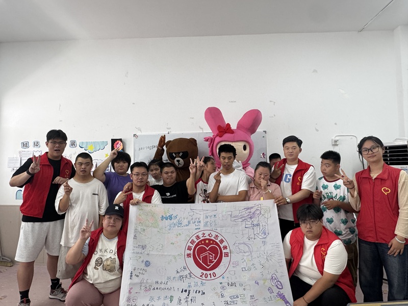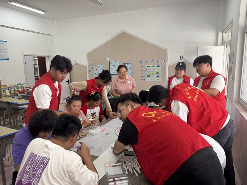 在创意绘画环节,志愿者与孩子们共同完成"每个孩子都是独一无二的宝藏"主题创作。孩子们在志愿旗帜上留下五彩痕迹,绘制充满童真的海报。志愿者身着玩偶服装与孩子们温馨互动,现场洋溢着欢乐与温情,展现了特殊儿童独特的艺术天赋和生命光彩。