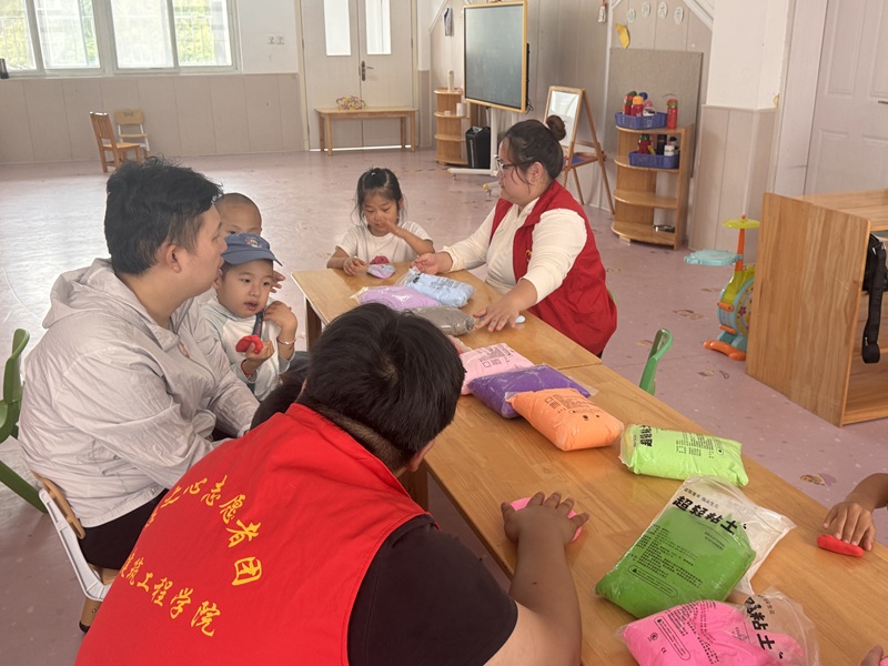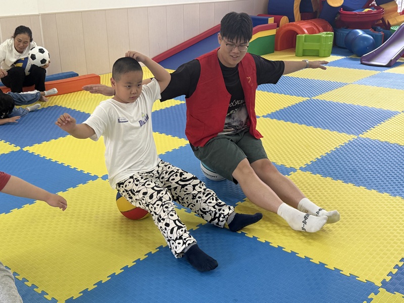 针对特殊儿童的康复需求,志愿者开展了多项训练活动:通过抖球游戏锻炼孤独症孩子的全身肌肉协调性;在感统室协助进行拍球训练,提升运动能力;借助粘土制作开展触感康复训练,帮助孩子们更好地感知世界。志愿者们还悉心指导唐宝学习刷牙、叠被等生活技能,培养他们的自理能力,体现了专业服务与人文关怀的有机结合。
