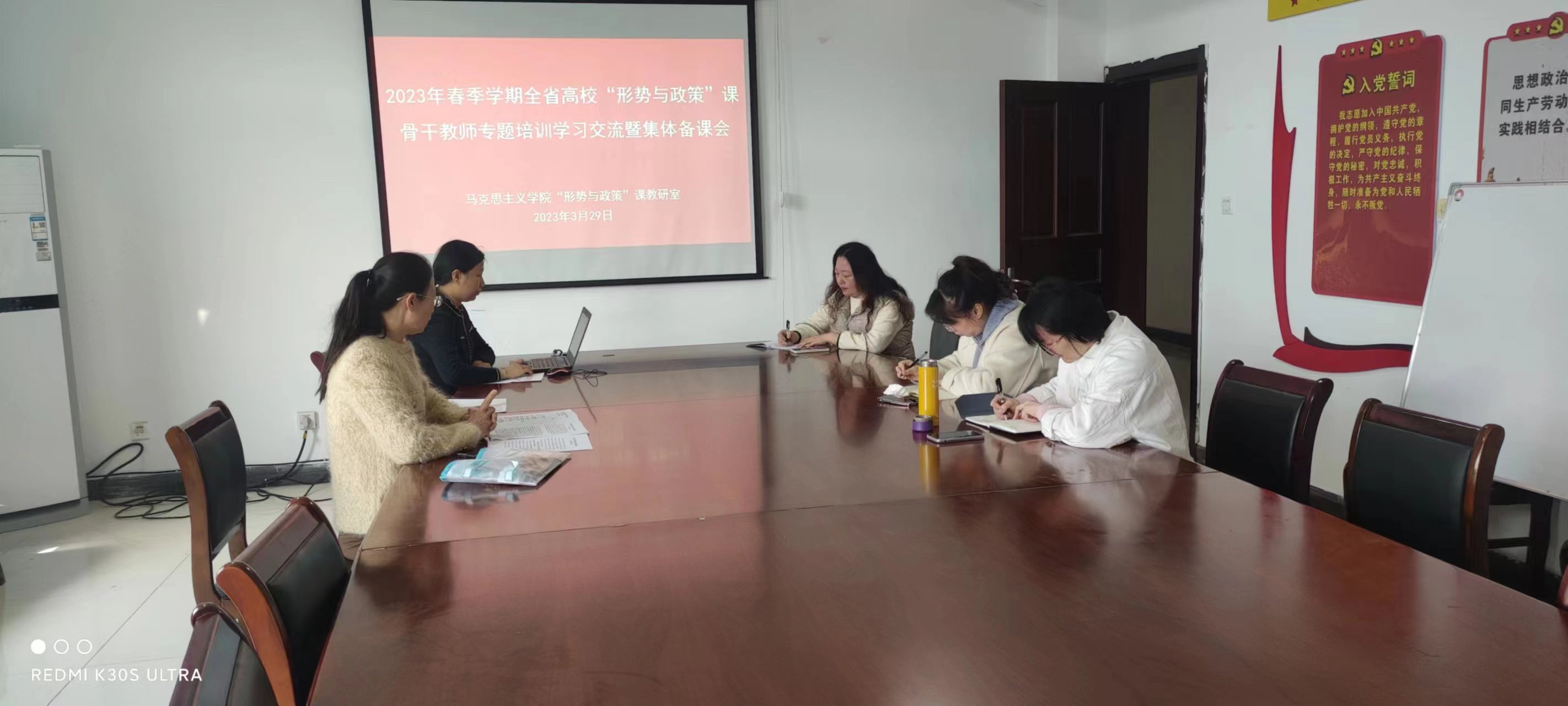3月29日上午,“形势与政策”课教研室举行了2023年春季学期全省高校“形势与政策”课骨干教师专题培训学习交流暨集体备课会,教研室全体教师参加本次会议。