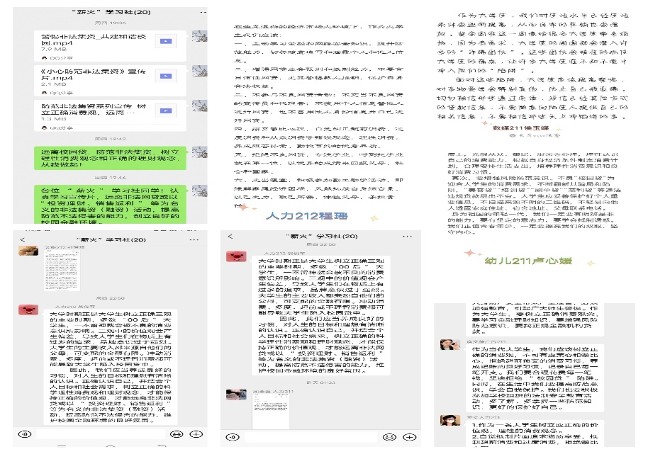 马克思主义学院“薪火”学习社指导老师丁增锋积极利用微信网络平台进行“远离非法集资”“警惕非法集资 共建和谐校园”“树立正确消费观,远离‘校园贷’”等系列法治宣传片投放,引导大学生社团成员围绕法治教育宣传周主题开展集中专题学习,并谈谈大学生远离非法集资和“校园贷”,树立正确消费观和财富观的体会感悟,取得良好的效果。