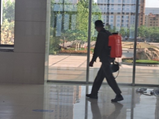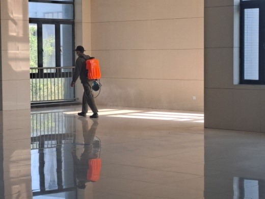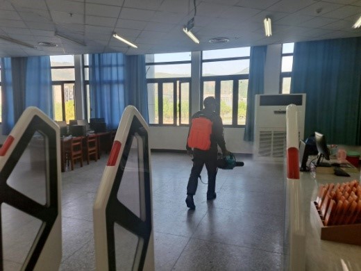 在二楼阅览室开放之前,馆长带领工作人员做了各项细致的准备工作。图书馆二楼门口设置了体温检测台,有专人负责验证行程码,测量体温,做详实的登记;在进入馆里大厅后,地面贴有蓝色出入口的指示标记,指引学生依次有序出入阅览室和图书馆;在文献中心的工作台前,为防止可能因为借阅人数过多而造成扎堆,特别设置了醒目的黄色一米线标志引导师生有序借阅。除此之外,图书馆对于内部的消杀防控尤其重视,准备了酒精、消毒液、口罩等各项防疫物资,另外还请专人进行了图书馆各个楼层的公共区域及阅览室内的专业喷洒消毒工作,今后还会将喷洒消杀列入日常工作,由专人负责定期进行,坚决遏制病毒。
