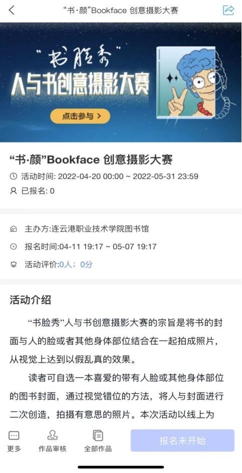 (2)通过活动报名界面,在“作品展示”栏目上传作品“书脸秀”创意摄影作品图片、合影图书/期刊资源名称、书籍内容或书评(100字以内)。