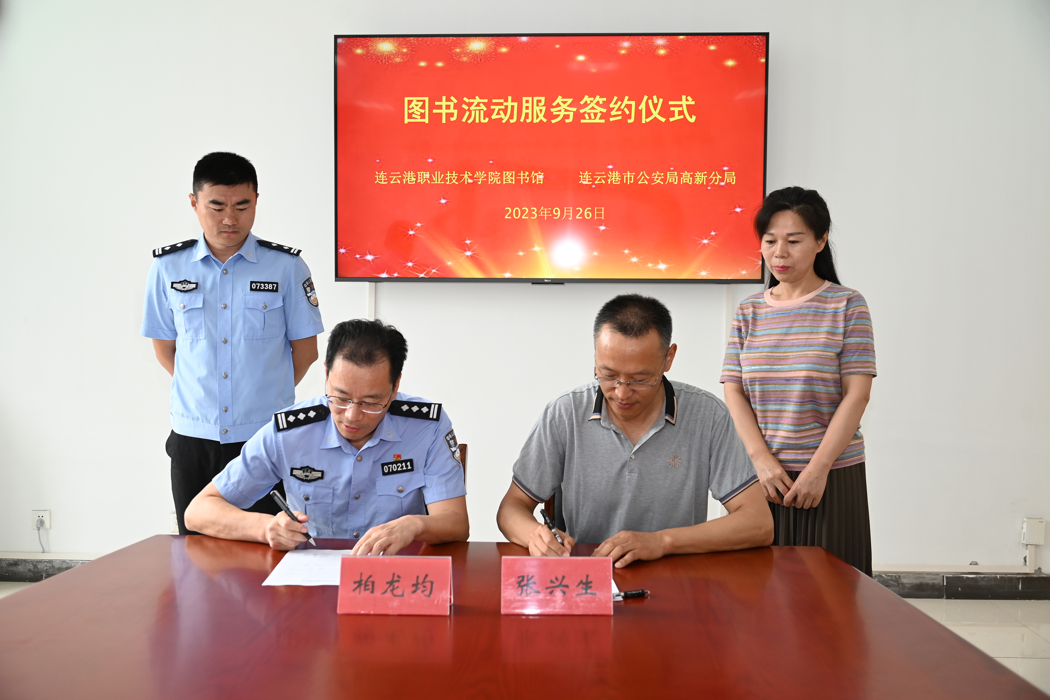 张兴生与柏龙均共同签署了连云港职业技术学院与连云港市公安局高新分局《图书流动服务协议书》。根据协议,我校图书馆将在不影响自身建设与流通借阅的基础上,实现图书资源的流通与共享,增强高校服务社会的能力。