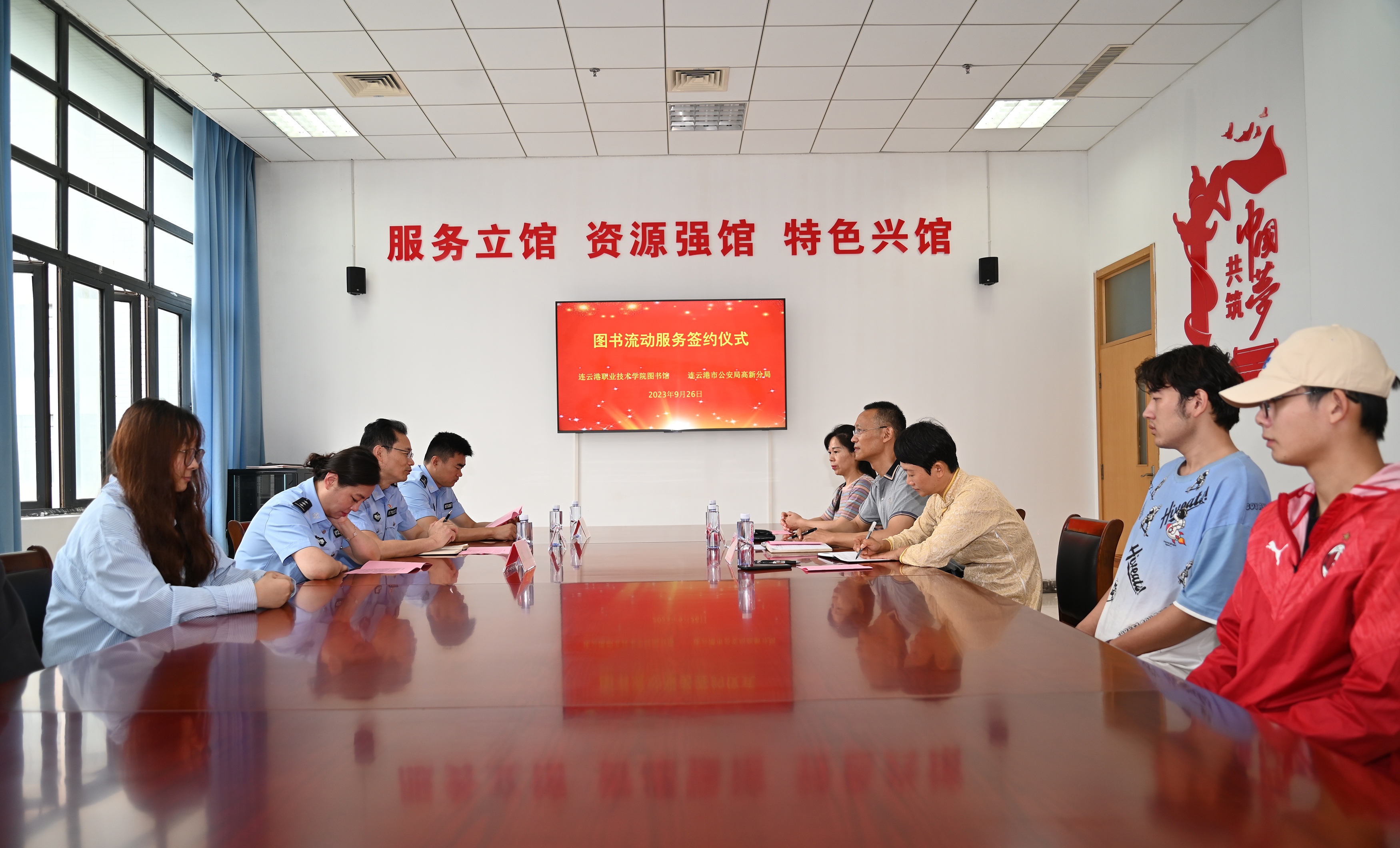2023年9月26日上午,我校图书馆与连云港市公安局高新分局图书流动服务签约仪式在学校图书馆313会议室举行。连云港市公安局高新分局党委副书记、政委柏龙均 ,图书馆直属支部书记、馆长张兴生,图书馆办公室主任相前、资源建设部主任王炬颖等参加签约仪式。