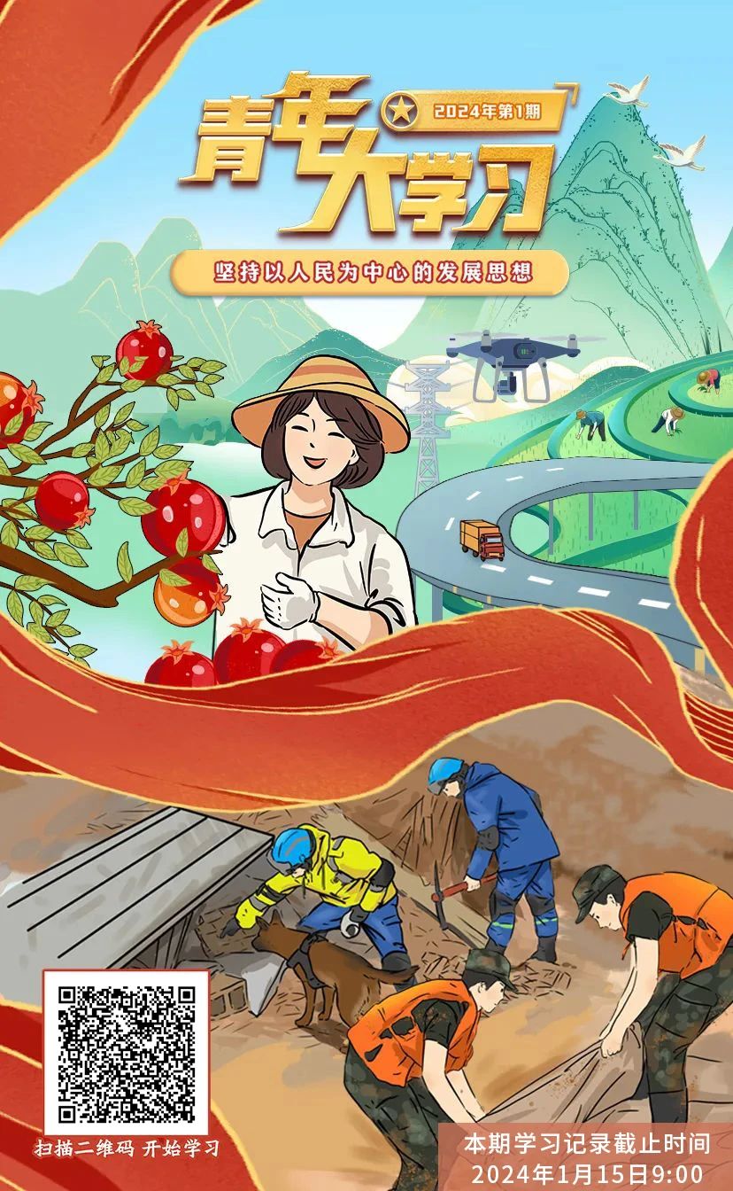 学习党的创新理论,争做新时代好青年。历史车轮滚滚向前,奋斗征程迎来新的一年。在二〇二四年新年贺词中,习近平总书记回望过去一年的步伐,展望新一年的奋斗目标,指出“我们要坚定不移推进中国式现代化”,强调“我们的目标很宏伟,也很朴素,归根到底就是让老百姓过上更好的日子”。铿锵的话语掷地有声、温暖人心,彰显人民至上的价值追求,鼓舞和激励亿万人民踔厉奋发、团结奋斗。