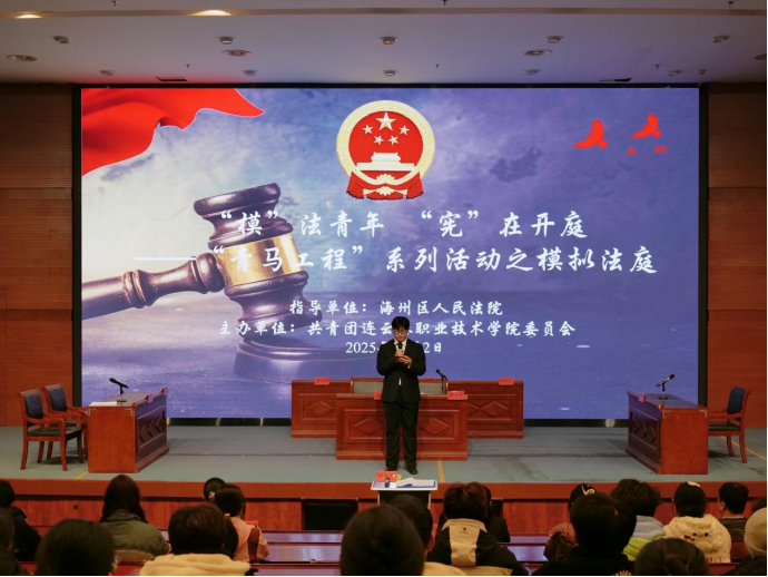 为深入学习贯彻习近平法治思想,增强法治观念和自我保护能力,积极引领广大团员青年争做知法、懂法、守法、用法、护法的实际践行者,12月2日下午,我校在图书馆报告厅举办“‘模’法青年,‘宪’在开庭——青马工程系列活动之模拟法庭”主题教育活动。本次活动由校团委主办,特别邀请海州区人民法院少家庭员额法官张雨虹、法官助理李明阳莅临指导。