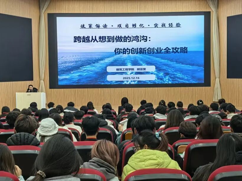 为推进创新创业赛事组织,挖掘培育优质项目,助力师生提前备战2026年江苏省职业院校创新创业大赛,12月16日下午,我校在大学生文化艺术中心报告厅举办2025-2026学年“青马工程”培训班专题讲座第五讲。讲座特邀建筑工程学院顾亚雯老师,以《跨越从想到做的鸿沟:你的创新创业全攻略》为题开讲,校团委书记孙明珠主持,近200名青马学员与二级学院学生代表参加。