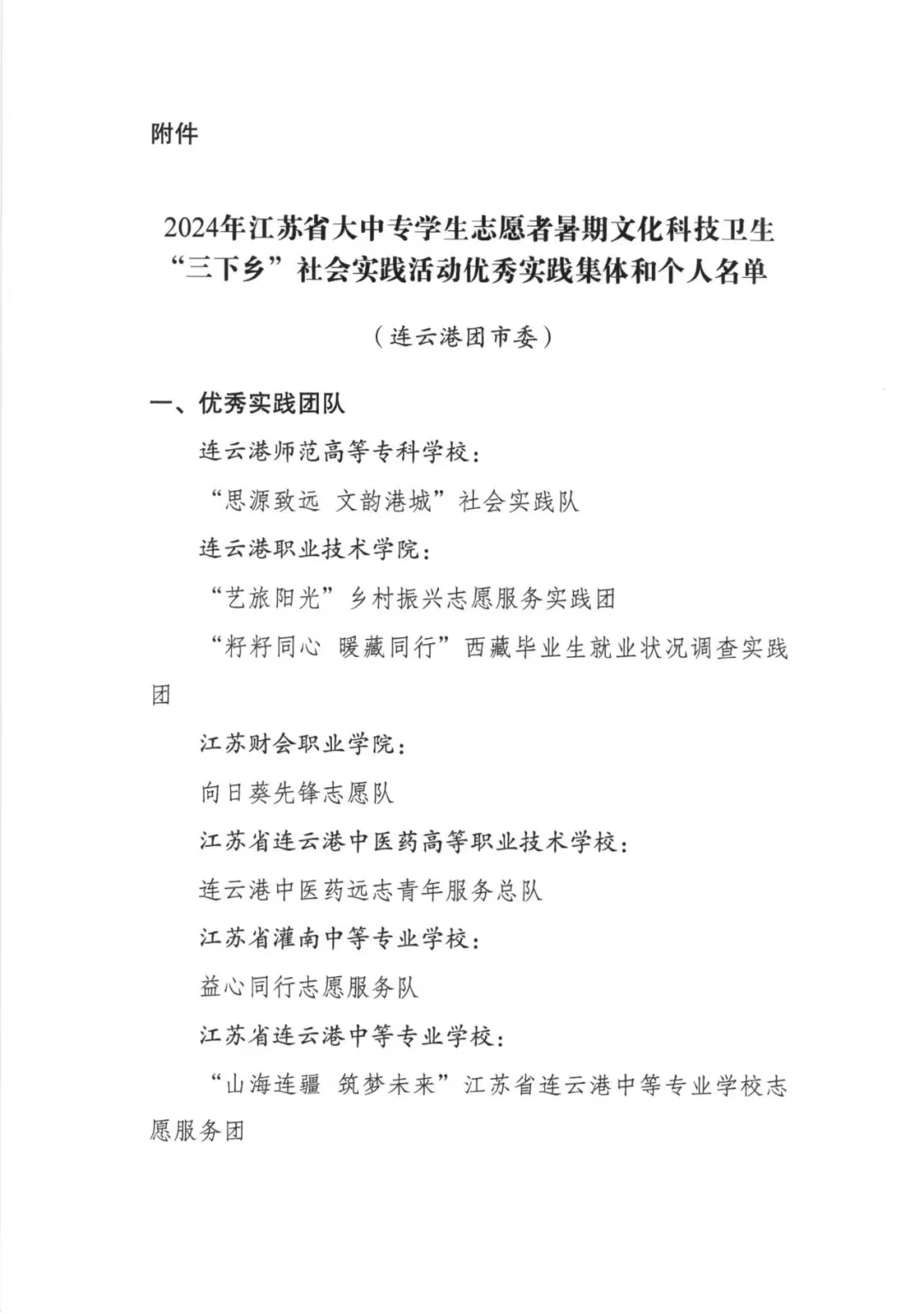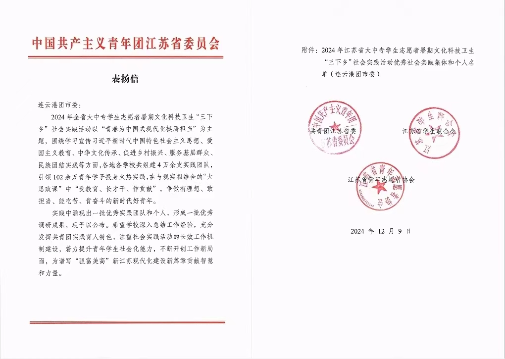 近日,由共青团江苏省委、江苏省学生联合会、江苏省青年志愿者协会联合发布的2024年全省大中专学生志愿者暑期文化科技卫生“三下乡”社会实践活动表彰名单中,我校凭借出色的表现和卓越的实践成果,荣获多项表彰。其中,我校“艺旅阳光”乡村振兴志愿服务实践团、“籽籽同心暖藏同行”西藏毕业生就业状况调查实践团荣获“优秀实践团队”称号;孙含雪同学荣获“优秀实践个人”称号;季辰老师荣获“优秀指导老师”称号。同时,数字商务学院的《连云港职业技术学院西藏籍民族毕业生就业状况调研报告》、建筑工程学院的《乡村振兴背景下关爱留守儿童现状对策研究——以连云港市灌南县百禄镇为例》调研报告荣获“优秀调研报告”奖项。