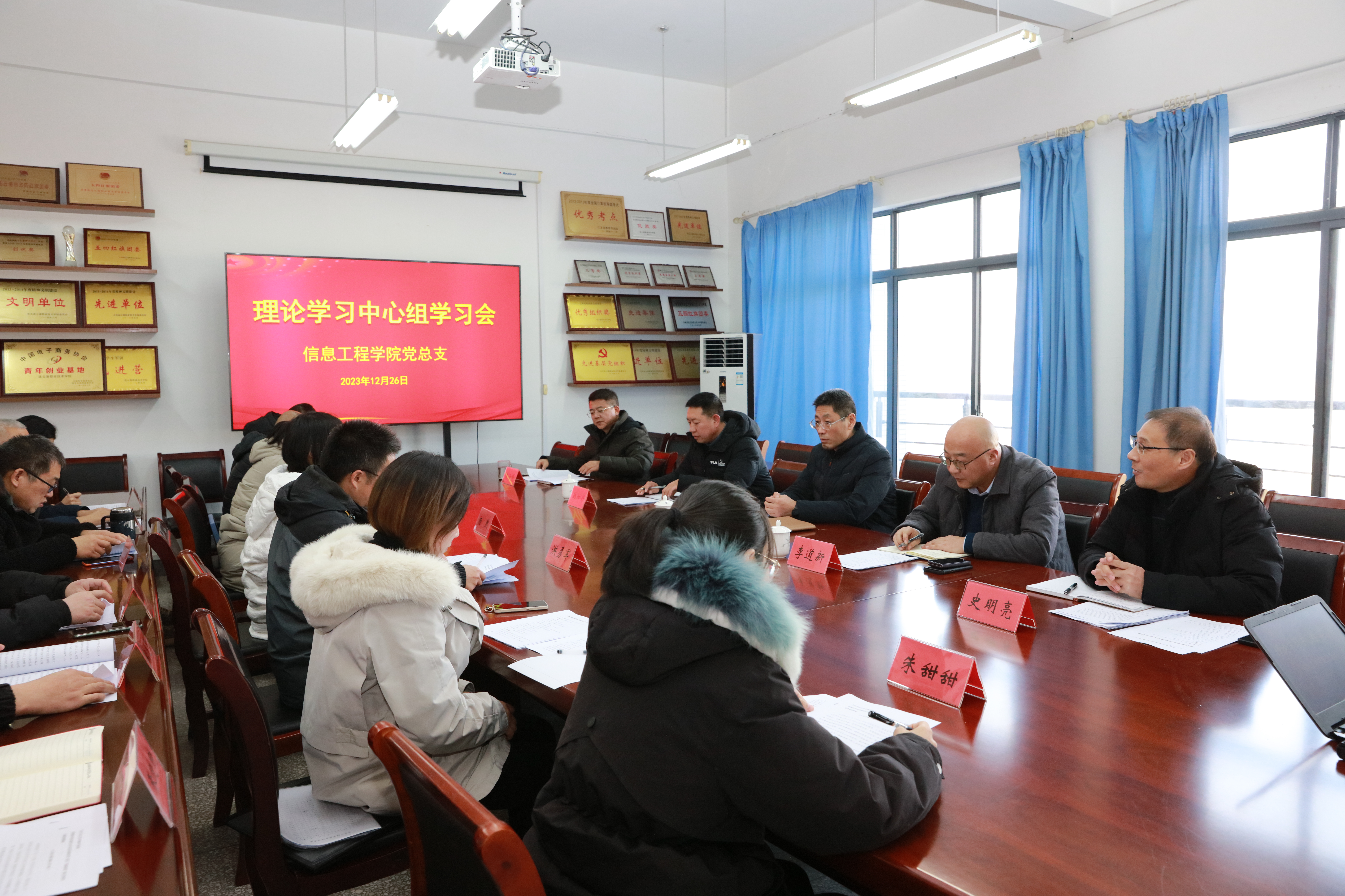 12月26日下午,我院理论学习中心组集中学习了习近平总书记在中央政治局第九次学习时会议精神、在中央政治局第五次学习时的会议精神、在江苏考察时的重要讲话精神及习近平总书记对宣传思想文化工作重要指示精神等内容。校党委书记刘江船对党总支理论学习中心组学习进行了巡学旁听,党委办公室主任、院长办公室主任李道新,党委委员、党委宣传部部长韩加好,信息工程学院全体理论学习中心组成员参加了会议,会议由信息工程学院党总支书记史明亮主持。