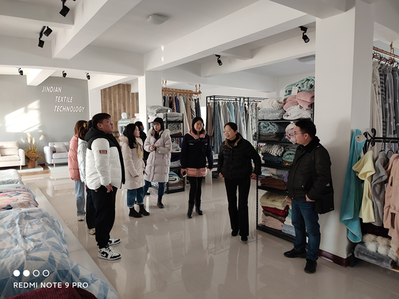 连云港金典纺织科技有限公司隶属于国家级重点高新技术企业连云港鹰游纺机集团,是一家具有自主进出口权的外向型家纺和服饰生产企业,以人造毛皮面料、毛绒类家纺、家饰以及服装为主导产品,近年来通过阿里国际站、考拉海购、京东等平台大力拓展线上业务,对电子商务专业人才需求旺盛。在考察中,师生们先后参观了企业生产车间、产品展厅,并与公司人力资源、外贸部等部门领导进行了面对面的交流,全面了解了该公司电商业务开展现状、电商岗位技能需求以及相关岗位的薪资待遇、发展前景等信息,相关老师也向企业介绍我院电子商务专业发展历史、课程特色等情况,部分毕业班学生表达了到该公司实习就业的初步意向。