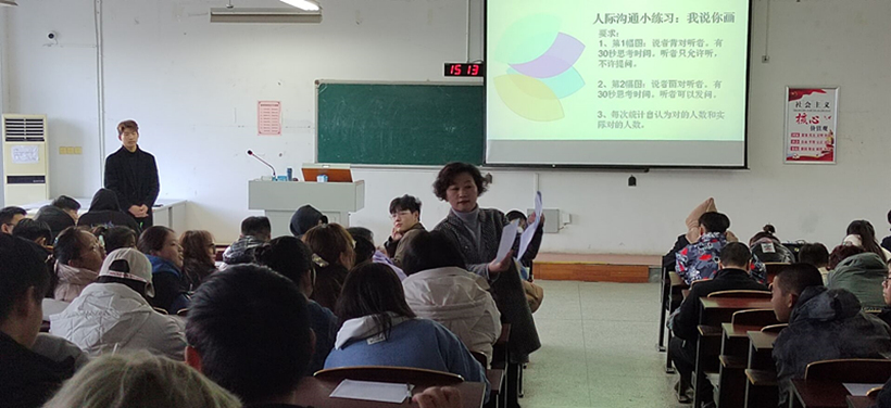 王海鹭以“积极心理学背景下人际关系沟通”为主题,从人际交往的现实依据的分析、人际交往的理论依据、人际关系在现实中的需求、人际关系在亲密关系中的沟通方法这四个部分进行深入浅出的讲解,指出人际关系的和谐是我们快乐幸福的重要源泉,好的社会关系是让我们保持幸福的秘诀,教育大学生要正确认识心理问题,学会沟通与交流,建立良好的人际关系。座谈会中王海鹭还进行了课堂互动“我说你画”,这个游戏让学生体会到了准确表达、用心聆听、思考质疑对人际沟通的重要性。