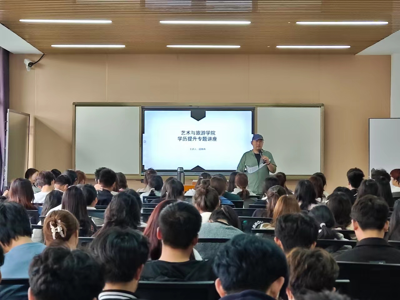 为提升艺旅学院23级学生学习积极性,让学生深入了解学历提升渠道,10月7日上午,艺术与旅游学院副院长邱伟伟为艺旅学院室内艺术设计和数字媒体艺术设计近300名新生分两次做了《学历提升专题讲座》。