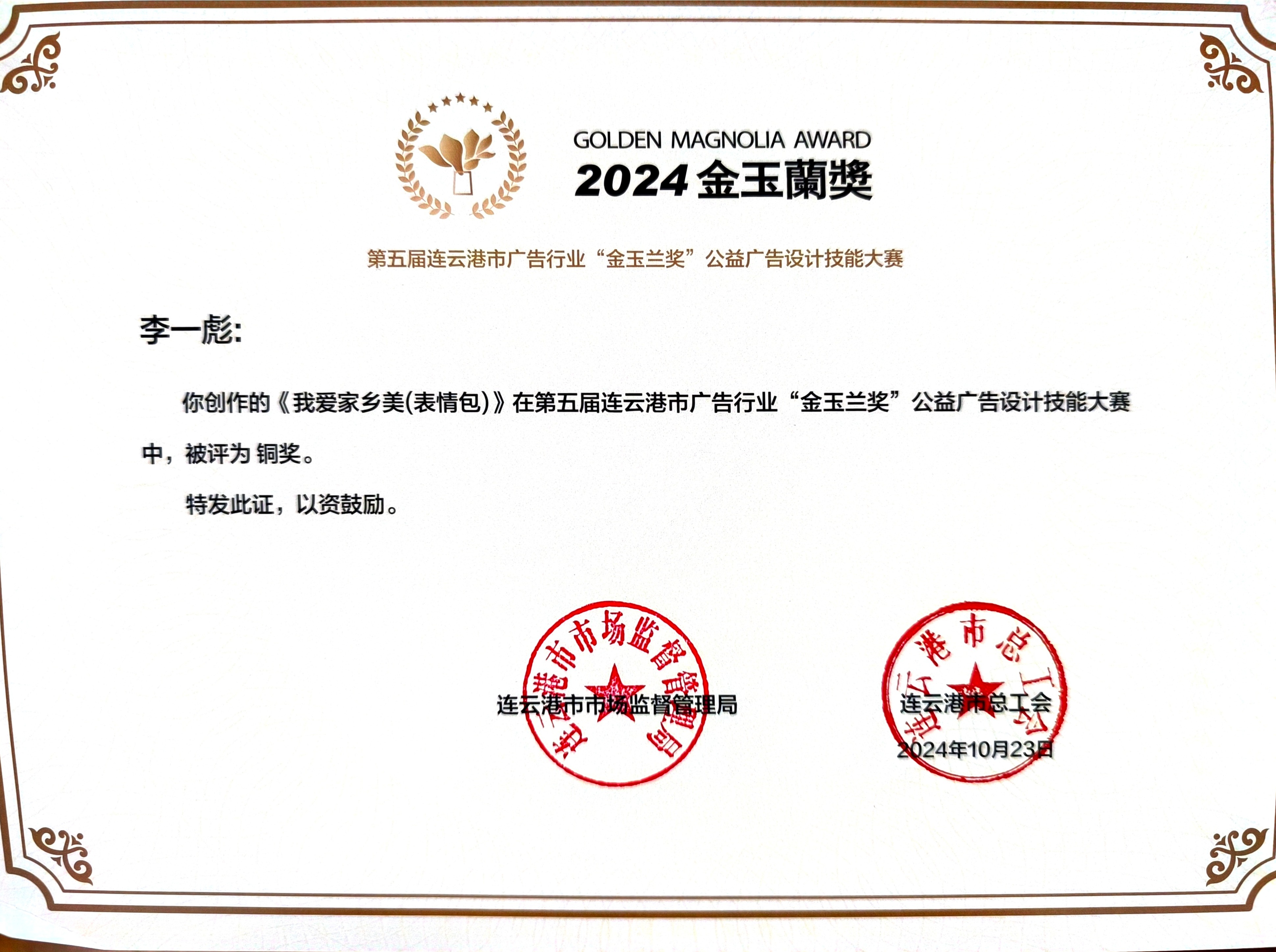 李一彪老师获第五届连云港市广告行业“金玉兰奖”公益广告设计技能大赛铜奖