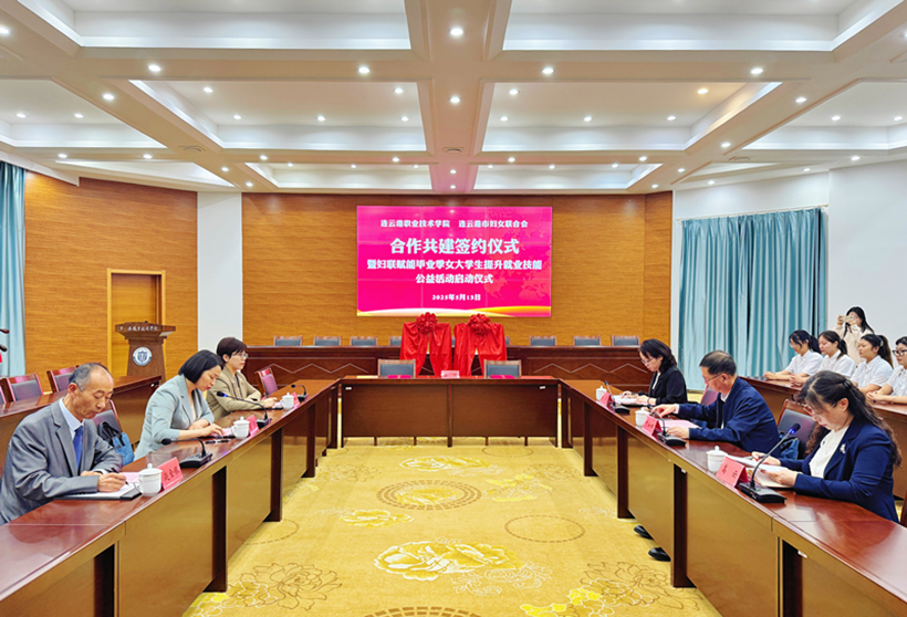 为深入贯彻落实国家关于促进高校毕业生就业创业的决策部署,构建女大学生创新创业全链条服务体系,深化“巾帼就业创业促进行动”,2025年5月13日上午,我校与连云港市妇女联合会在学校厚德楼一楼会议室举行合作共建签约仪式暨“妇联赋能毕业季女大学生提升就业技能”公益活动启动仪式。校党委副书记叶如田,连云港市妇联副主席陈红,江苏省产业教授、市妇联就创导师赵金银出席活动,相关职能部门负责人及30名女大学生代表参加。仪式由校党委学生工作部部长高云主持。